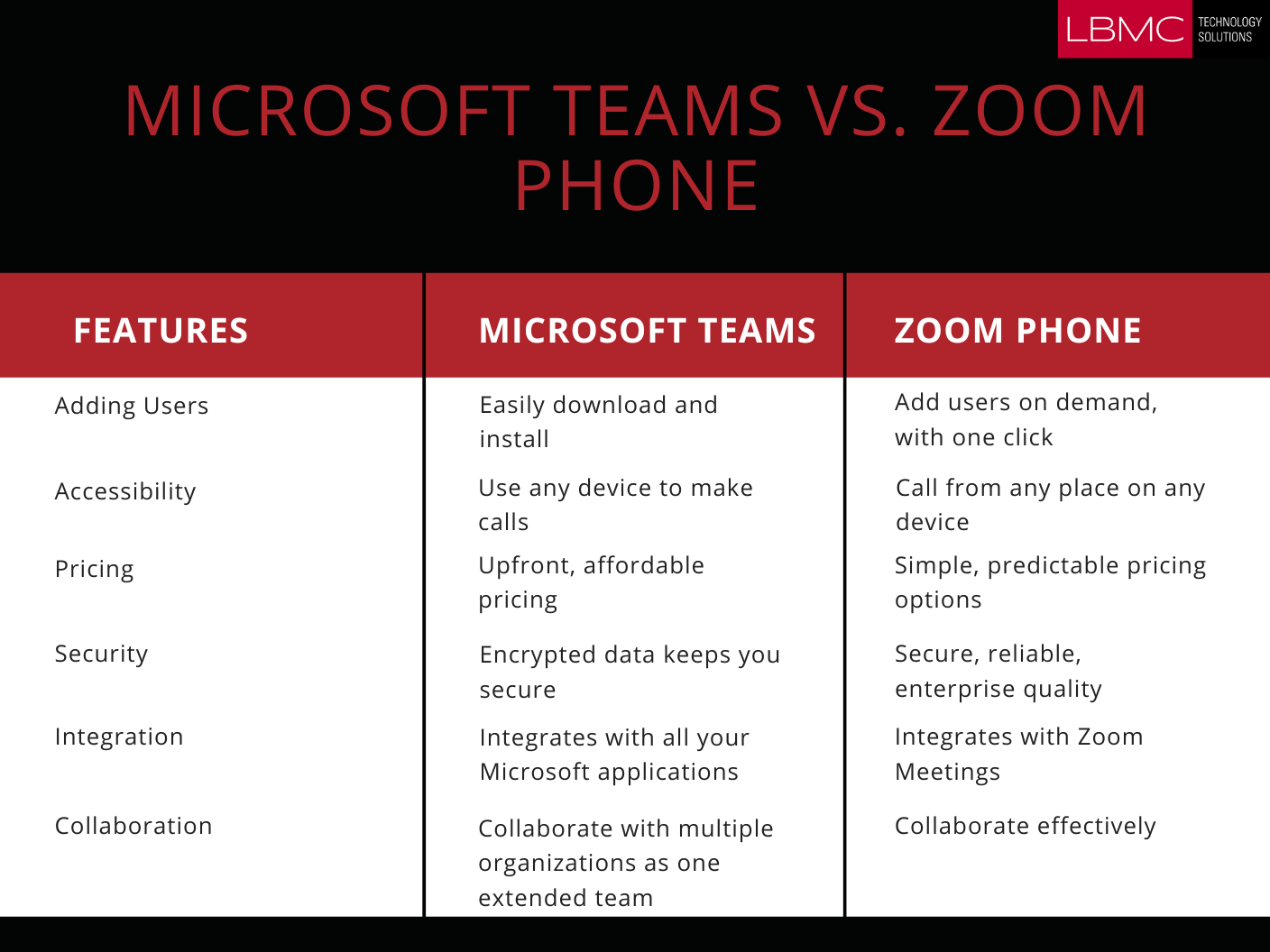 Two of the most popular phone systems are Zoom phone and Microsoft Teams Voice. LBMC Technology Solutions considers Teams Voice and Sangoma as the industry leaders for a variety of reasons. Check out our infographic to see a comparison of Microsoft Teams and Zoom Phone