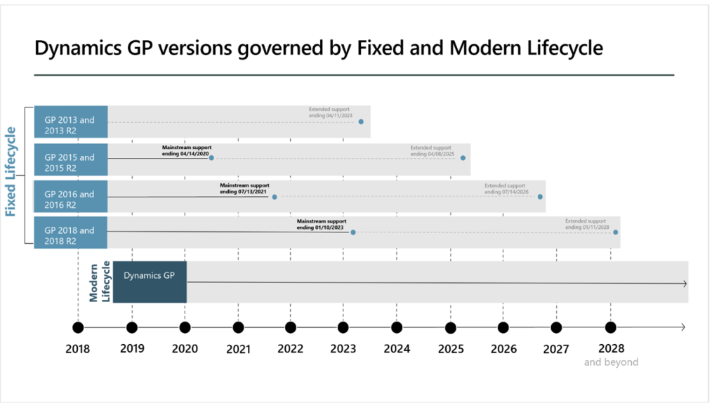 This means that current Dynamics GP users will include minor updates and new releases in the near future. New releases will contain regulatory (tax), security updates, and hotfixes, ensuring GP remains up to date. According to Microsoft, new releases will also include updates in usability, reliability, addressing top customer issues, and other areas that are critical in ensuring businesses run successfully on GP. You can see the full lifecycle plan here: Microsoft Lifecycle Management Dynamics GP.
