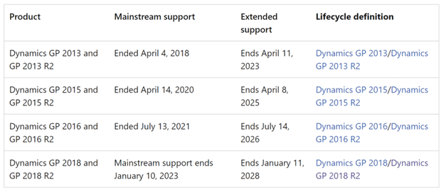 | Dynamics GP 2018 and GP 2018 R2 | Ended January 10, 2023 |