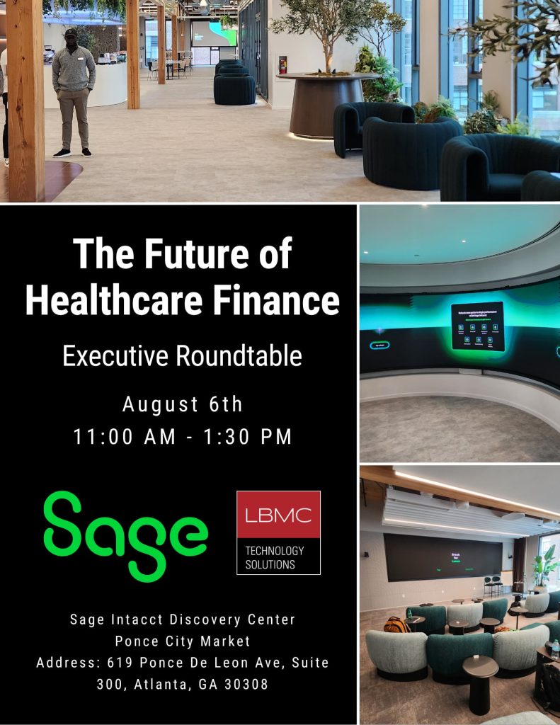 Join an exclusive group of CFOs and CEOs from leading healthcare organizations for a private executive lunch and roundtable hosted at the Sage Intacct Discovery Center in Ponce City Market. This intimate gathering will explore how today’s most forward-thinking healthcare organizations are transforming finance with cutting-edge technology.